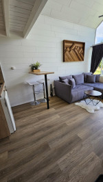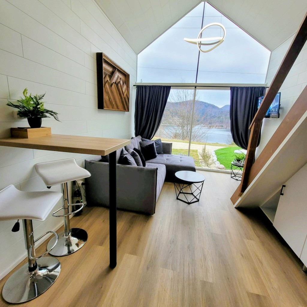 Na vyvýšenom poschodí sa nachádza dvojlôžko. Na prízemí si vychutnáte oddych a pohodu na štýlovej pohovke s výhľadom na okolitú prírodu. Pohovka  na prízemí je rozkladacia a slúži  aj ako prístelka v prípade potreby pre dve osoby. Nachádza sa tu aj kuchynský kút so všetkým, čo potrebujete pre prípravu skvelých jedál a tiež jedálenský pult s barovými stoličkami. V chate je dizajnová kúpeľňa a predsieň.